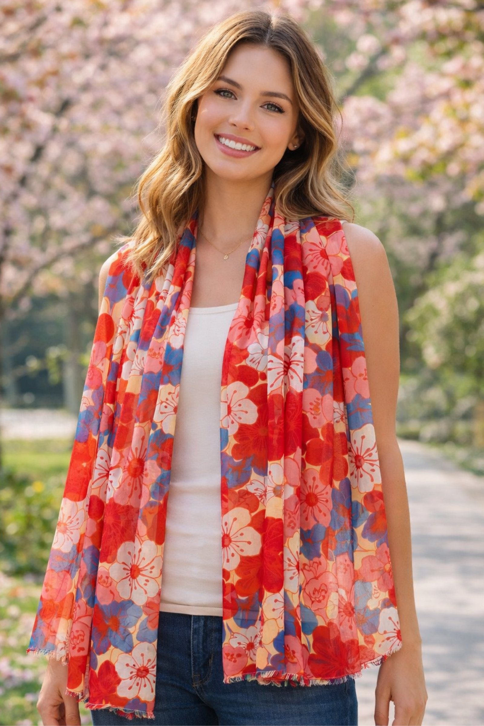 Cute Retro Cherry Blossom Print Frayed Scarf