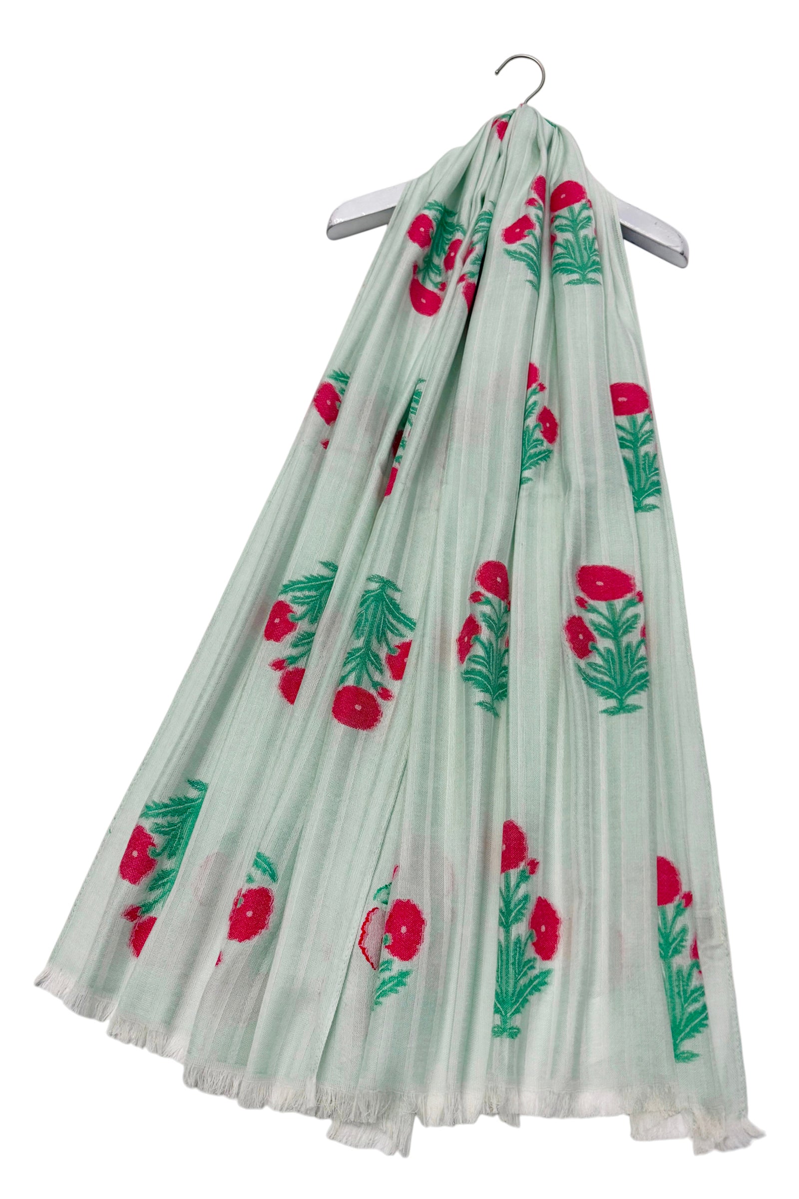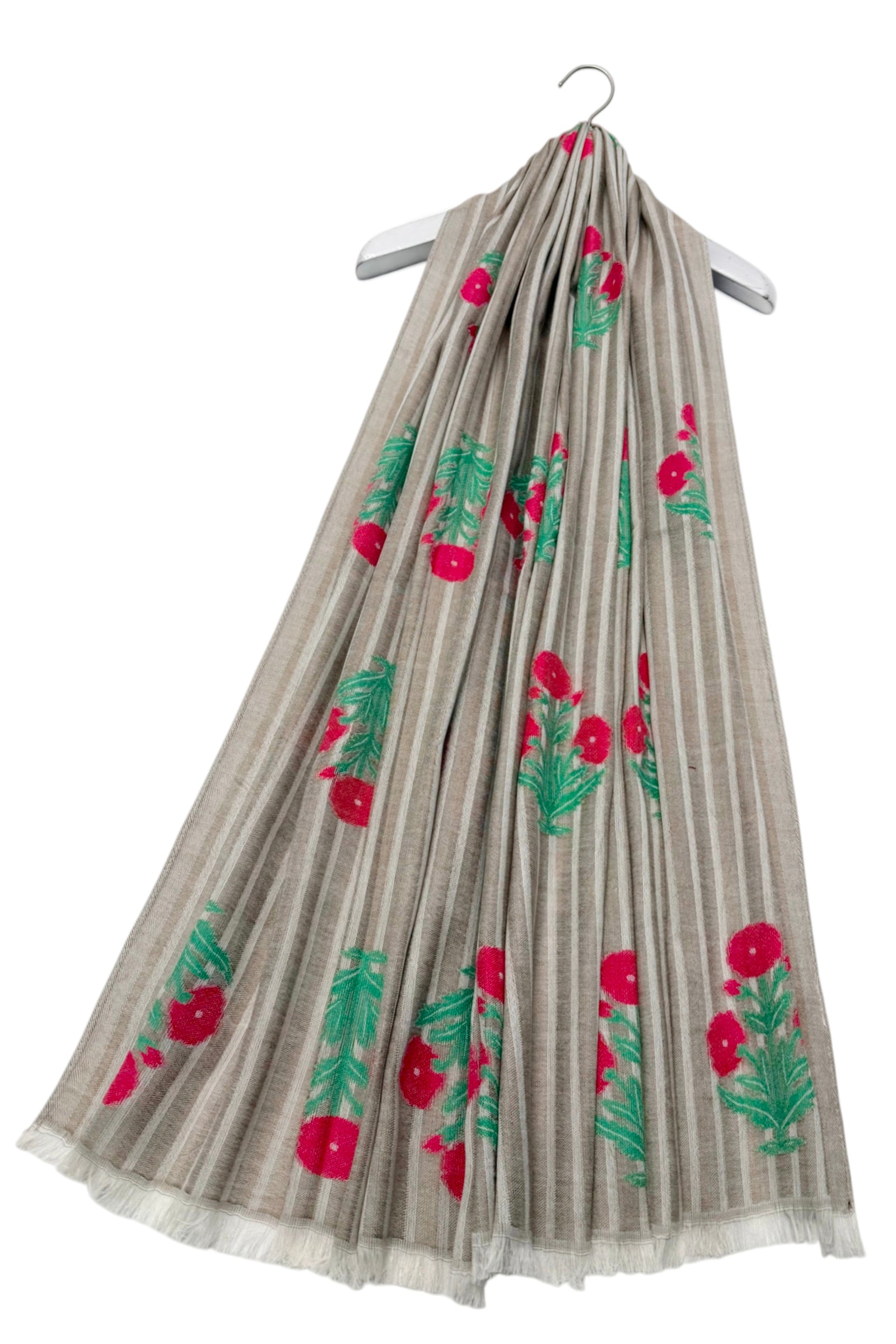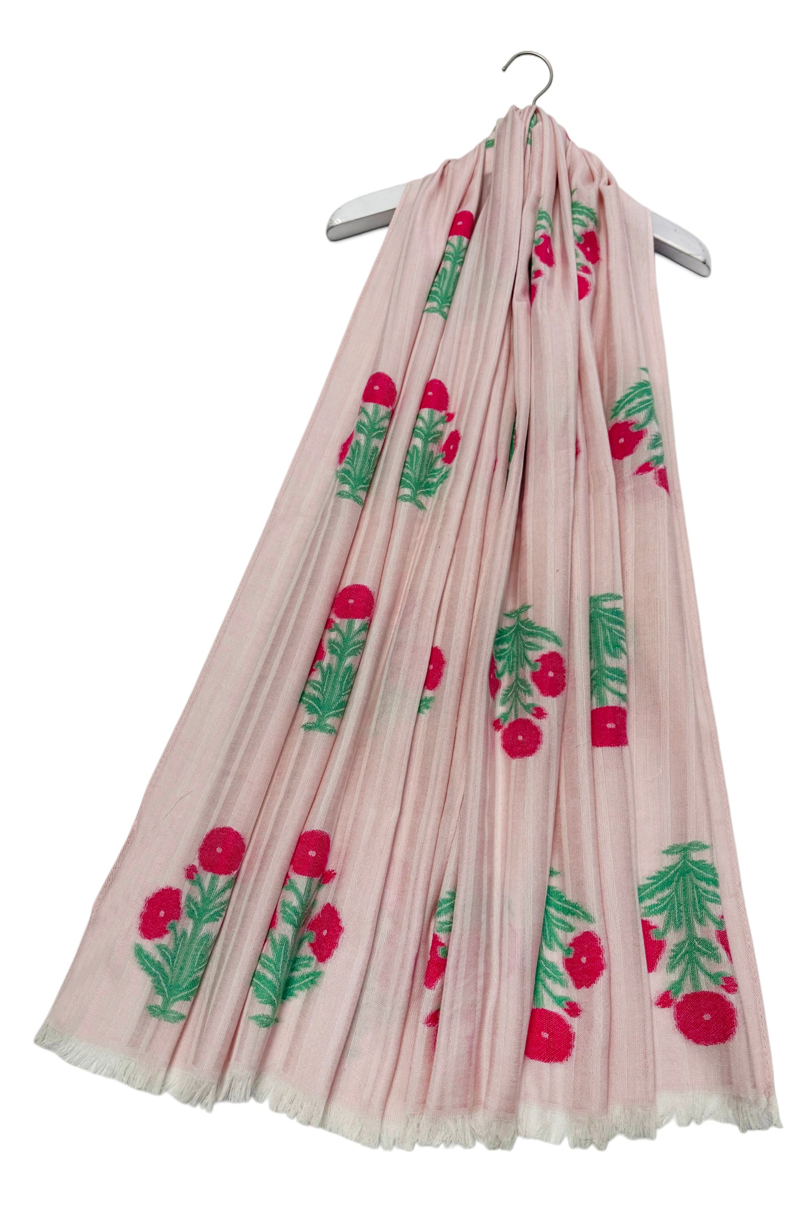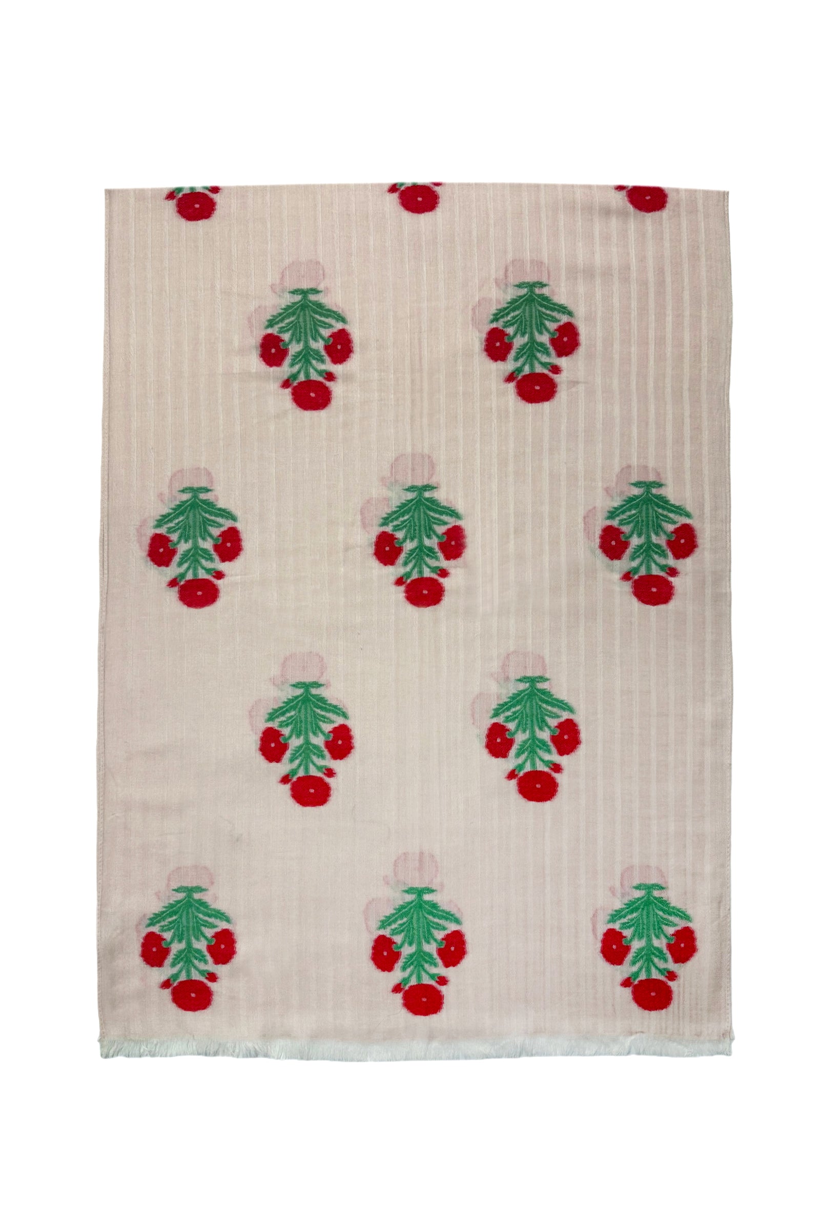 Floral Motif and Stripe Woven Cotton Frayed Scarf