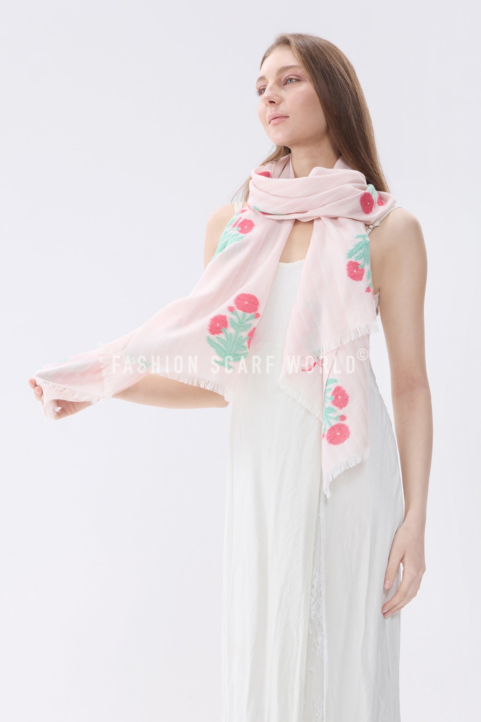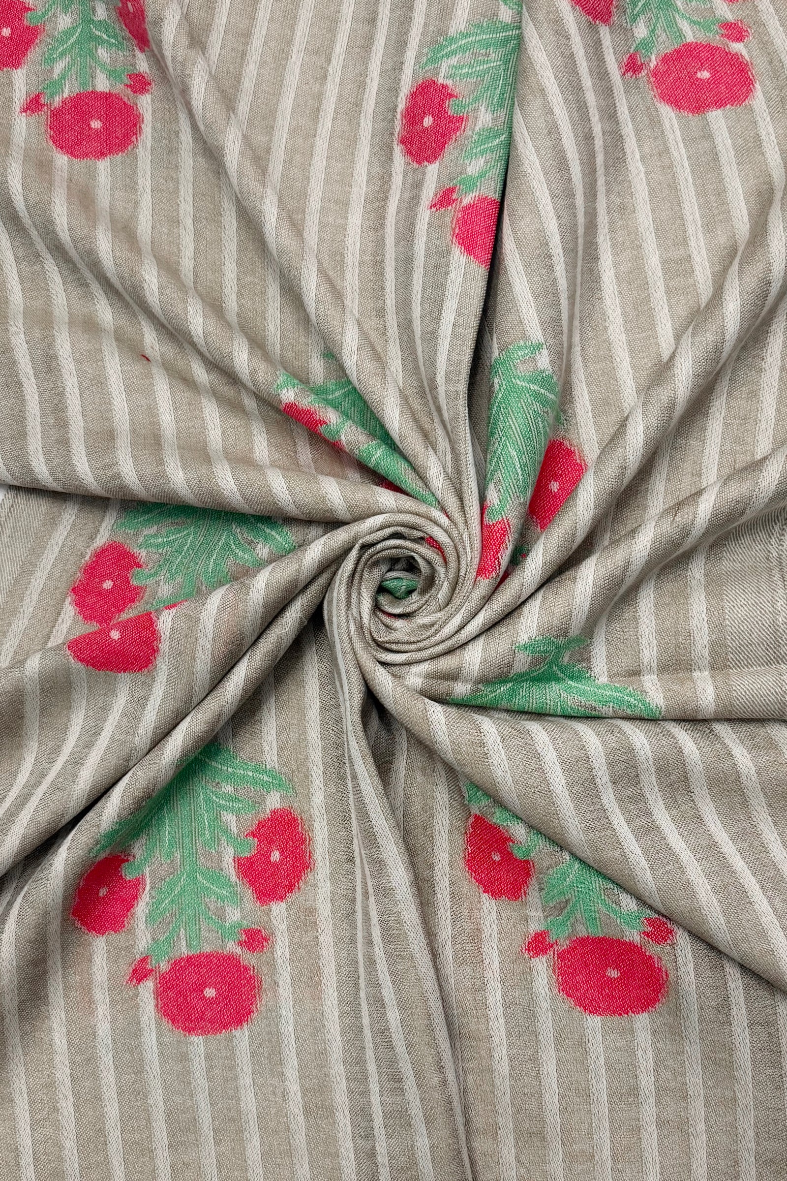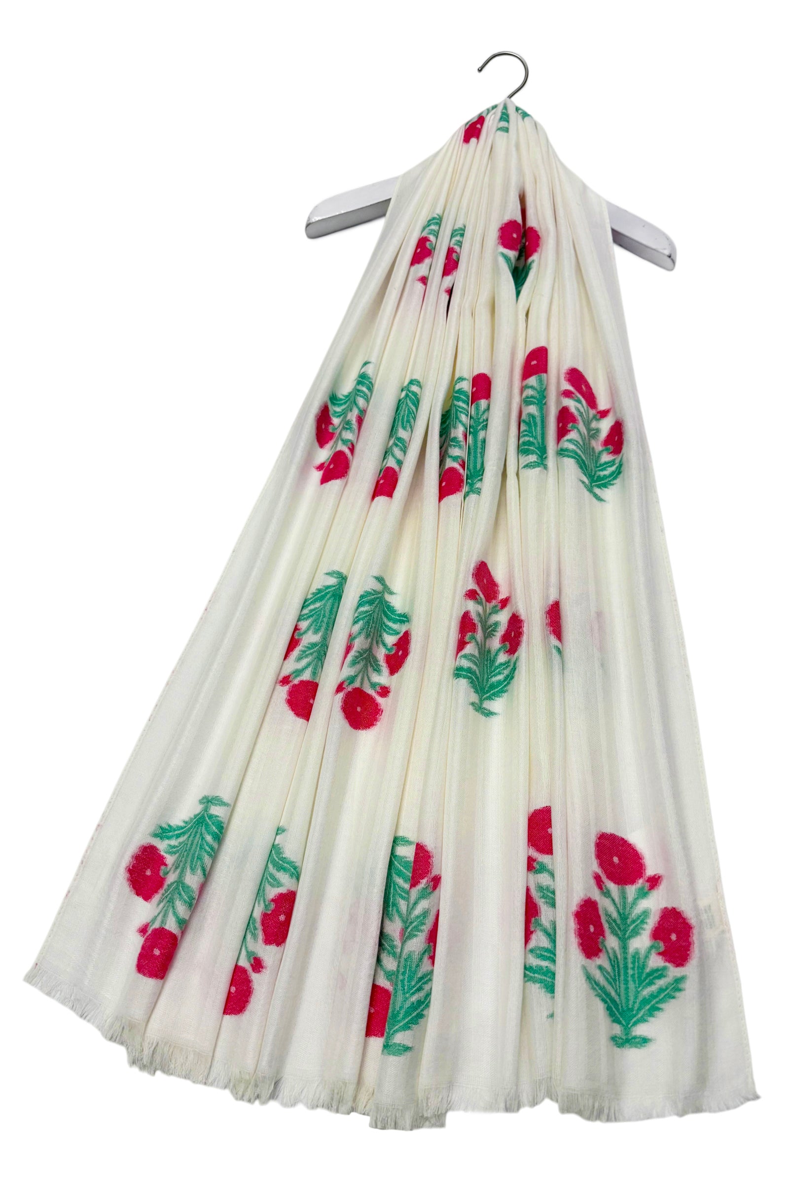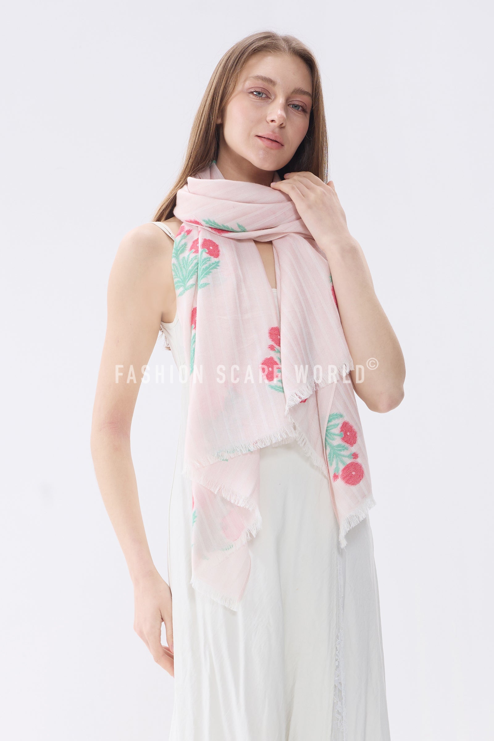 Floral Motif and Stripe Woven Cotton Frayed Scarf