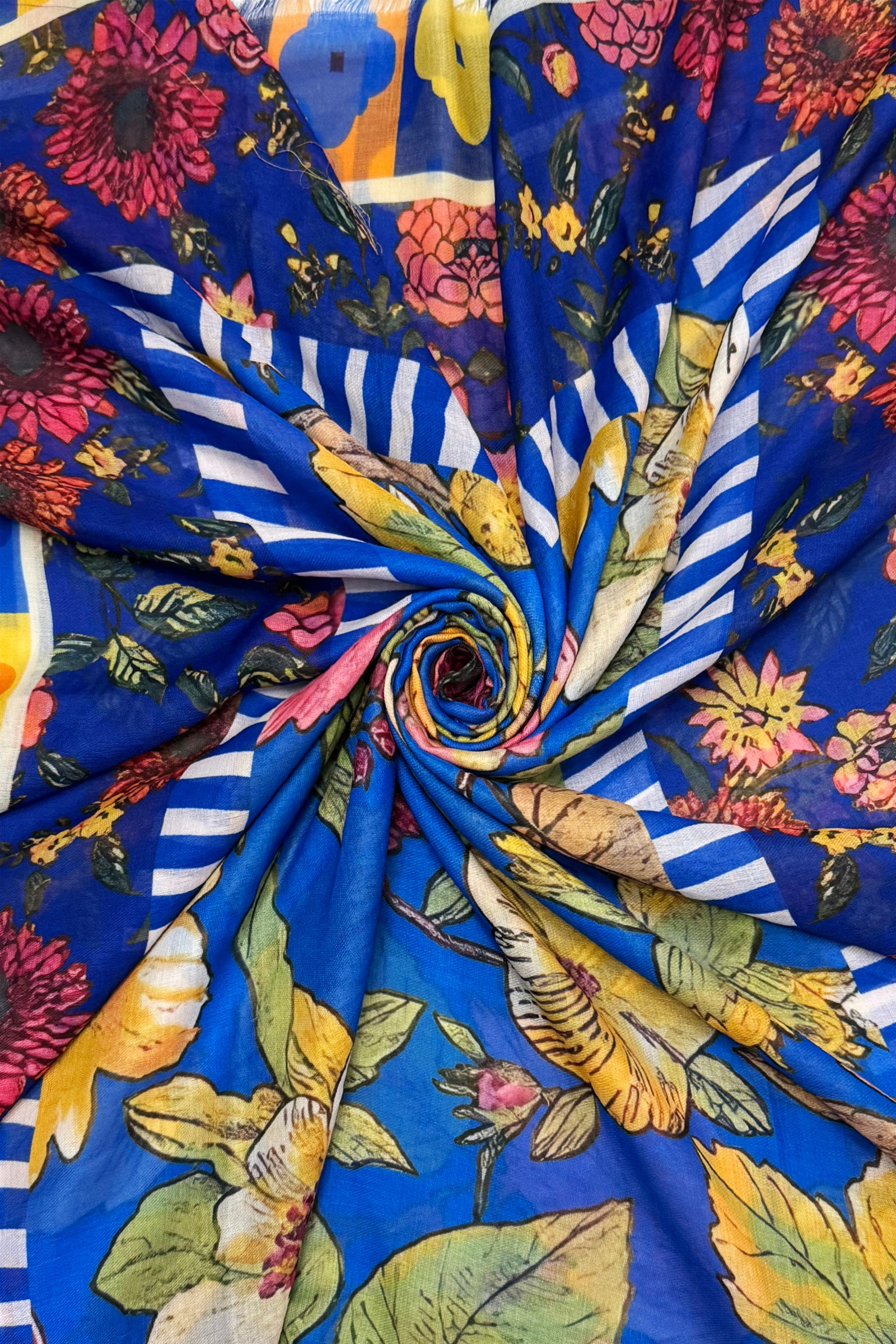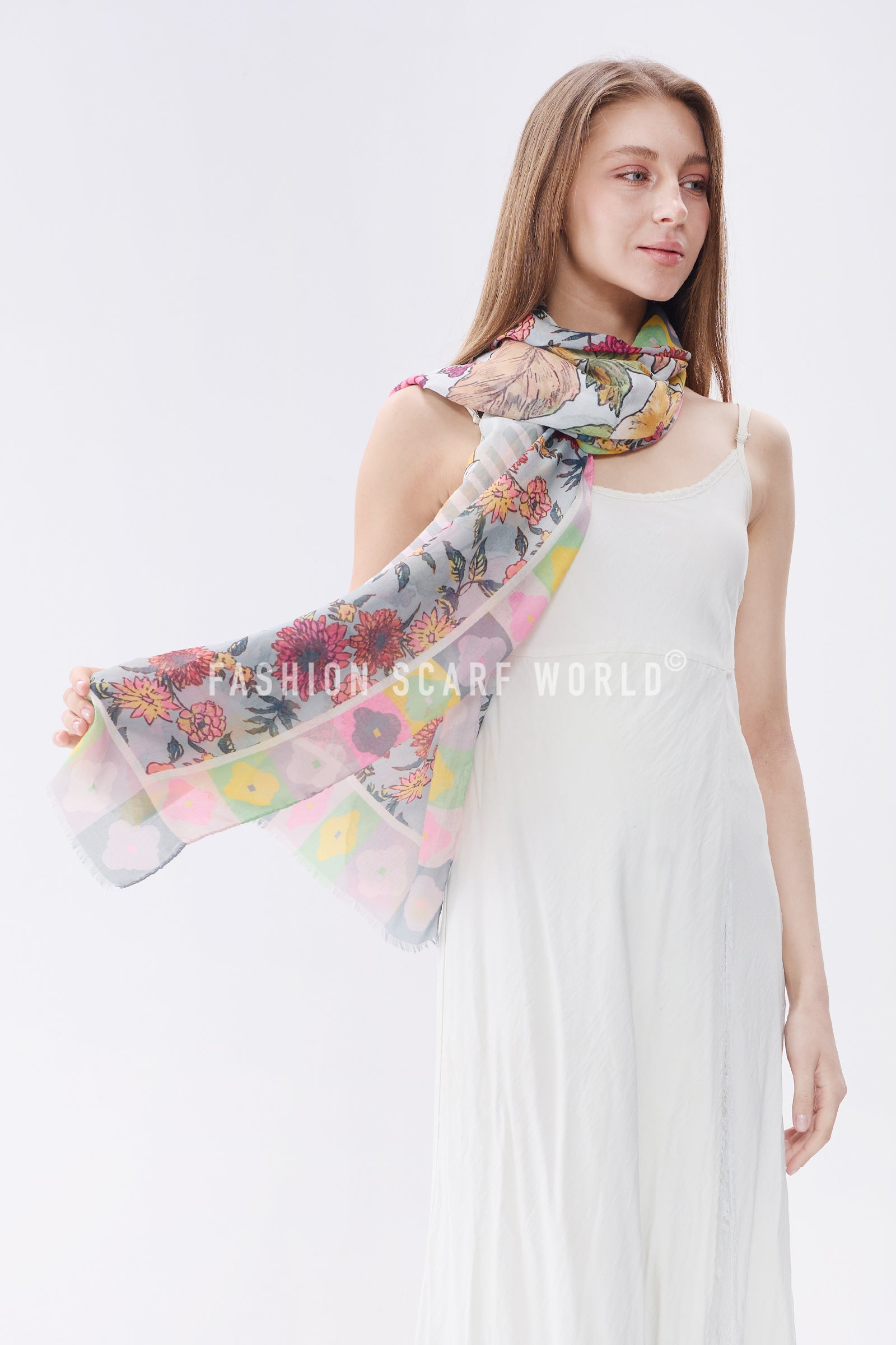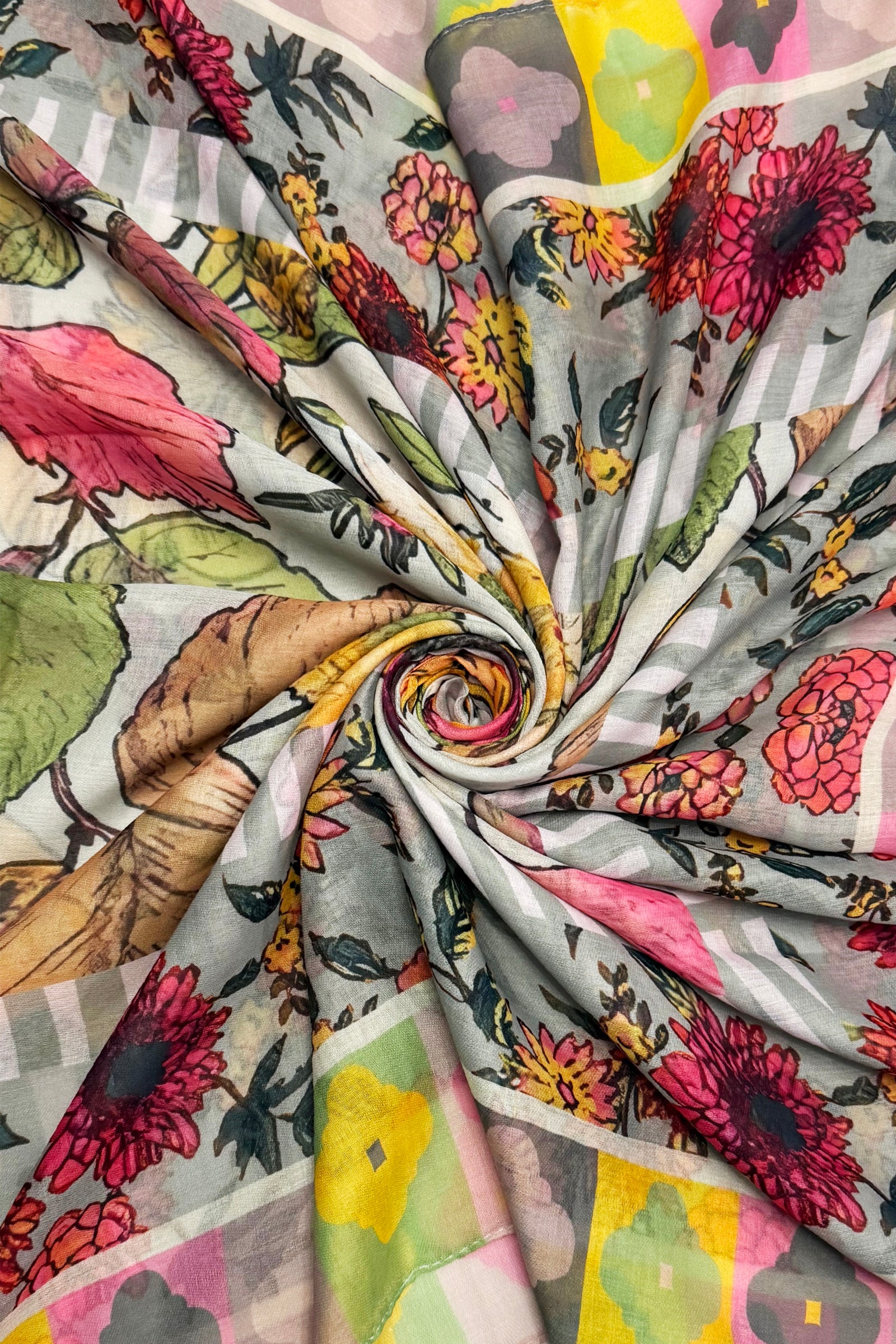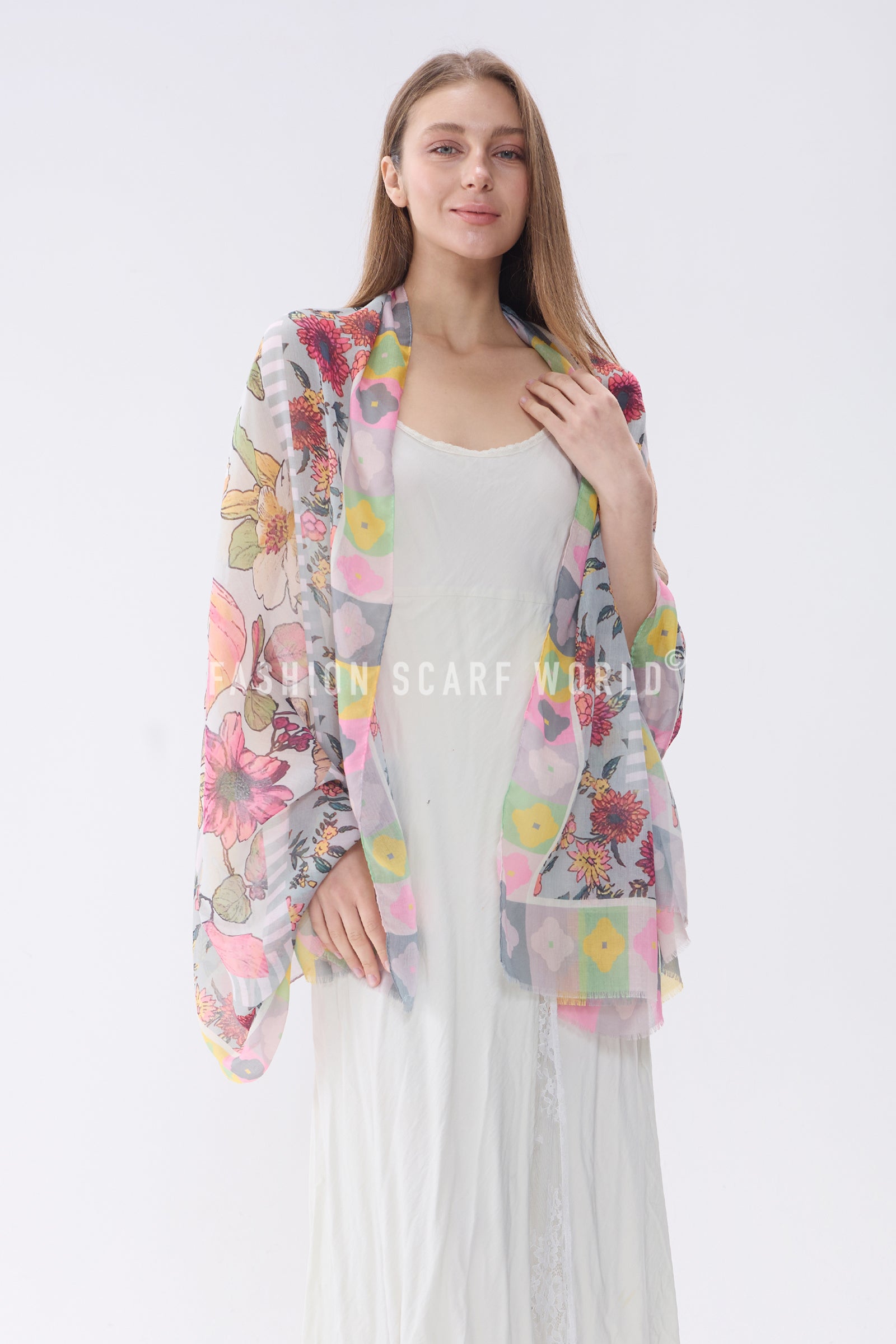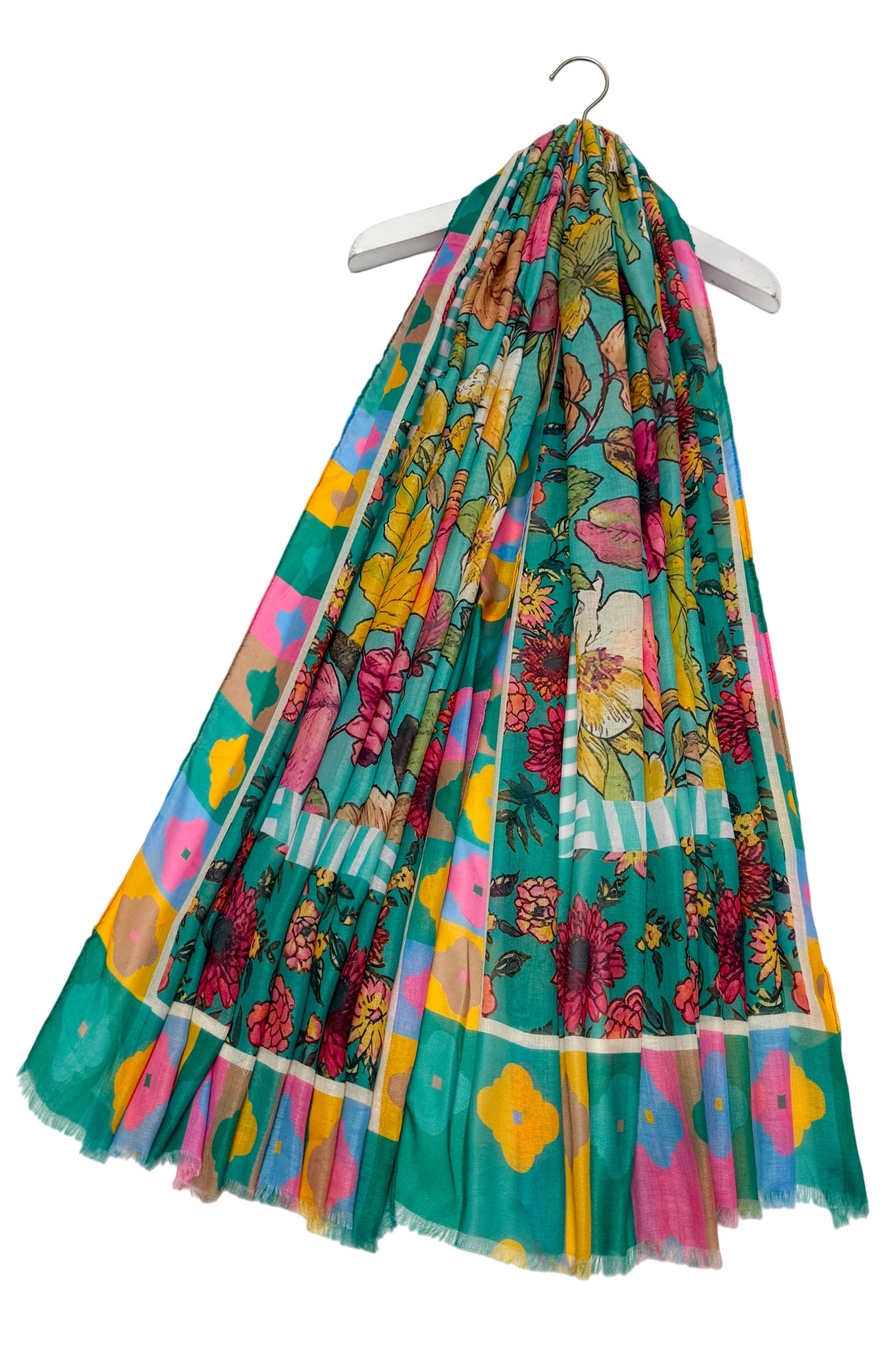 Vibrant Floral Border Print Frayed Scarf