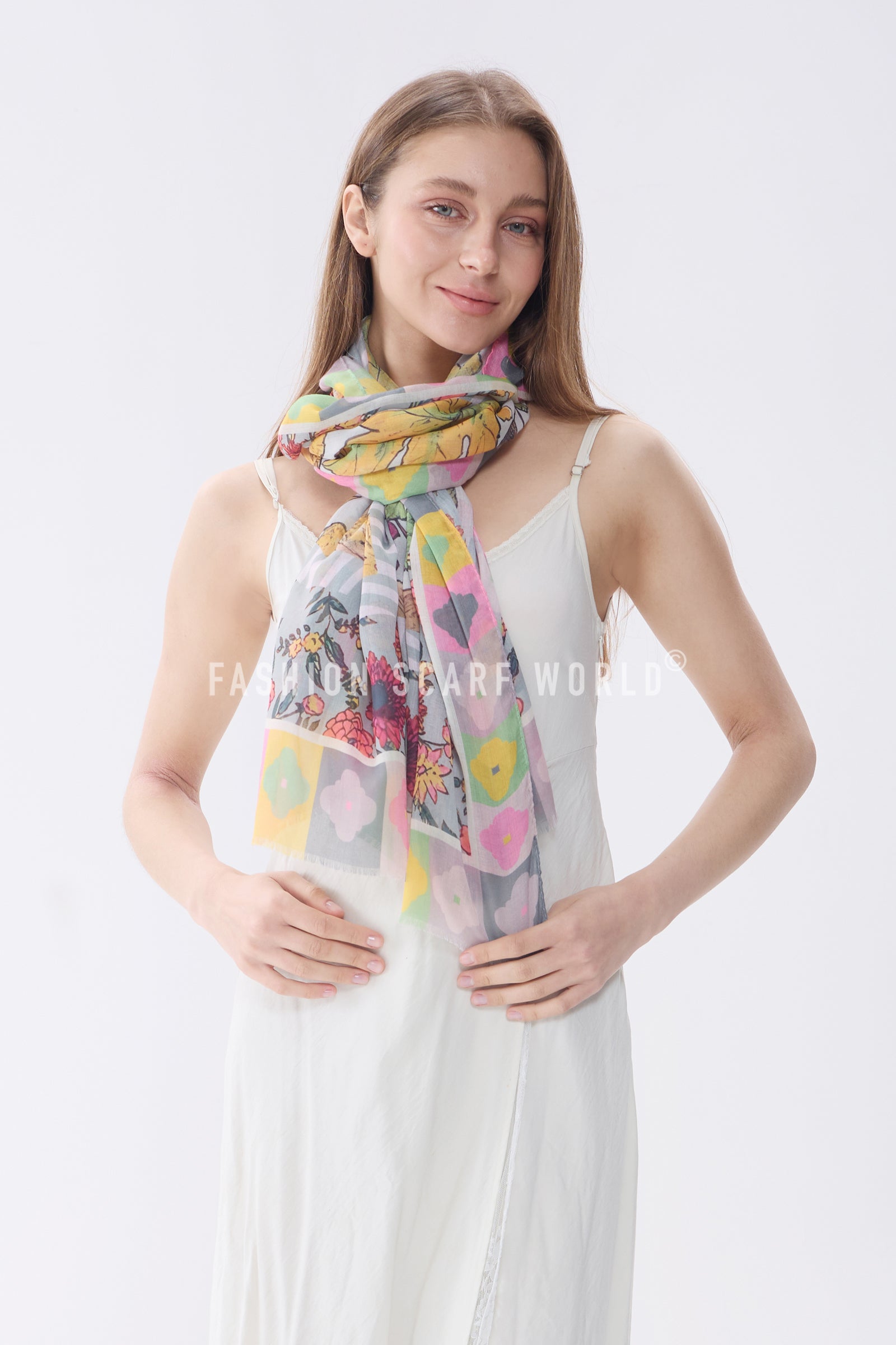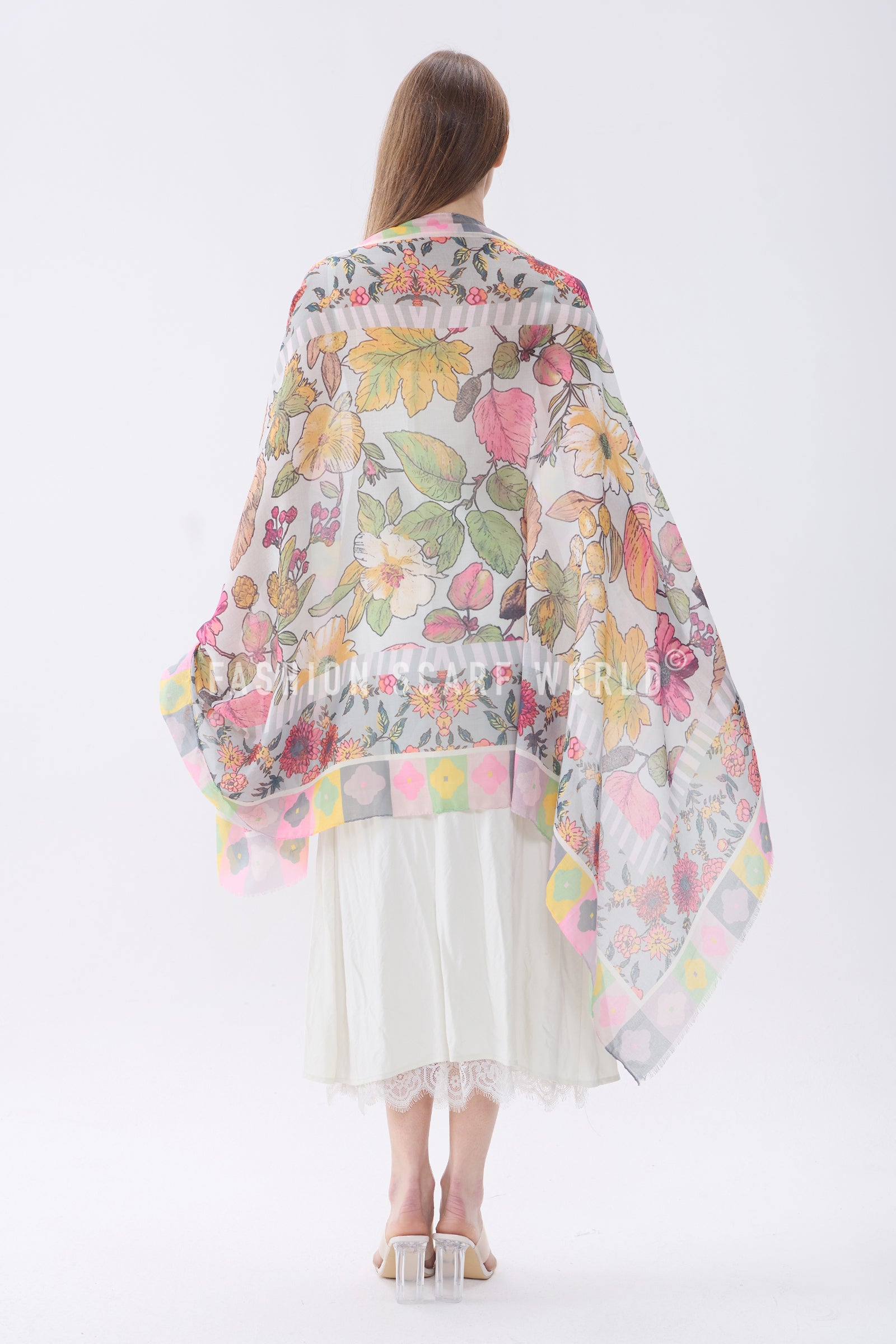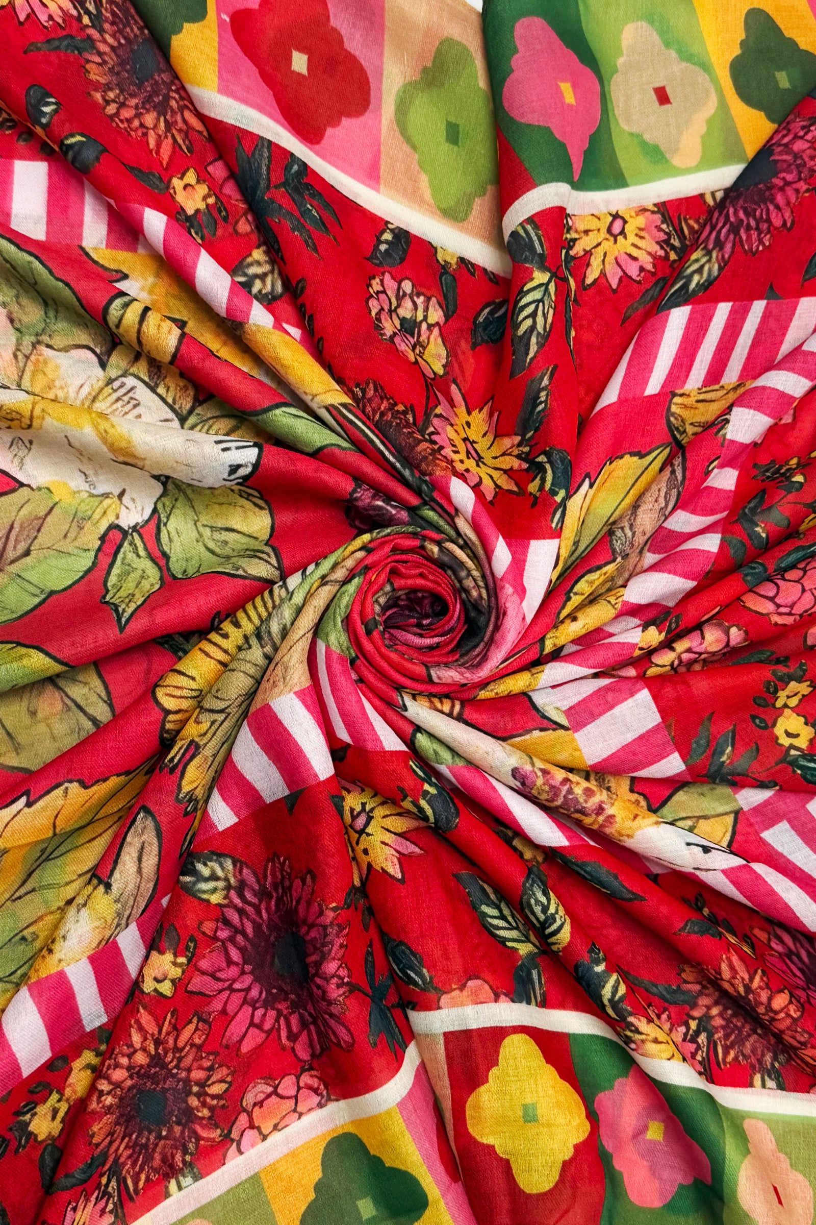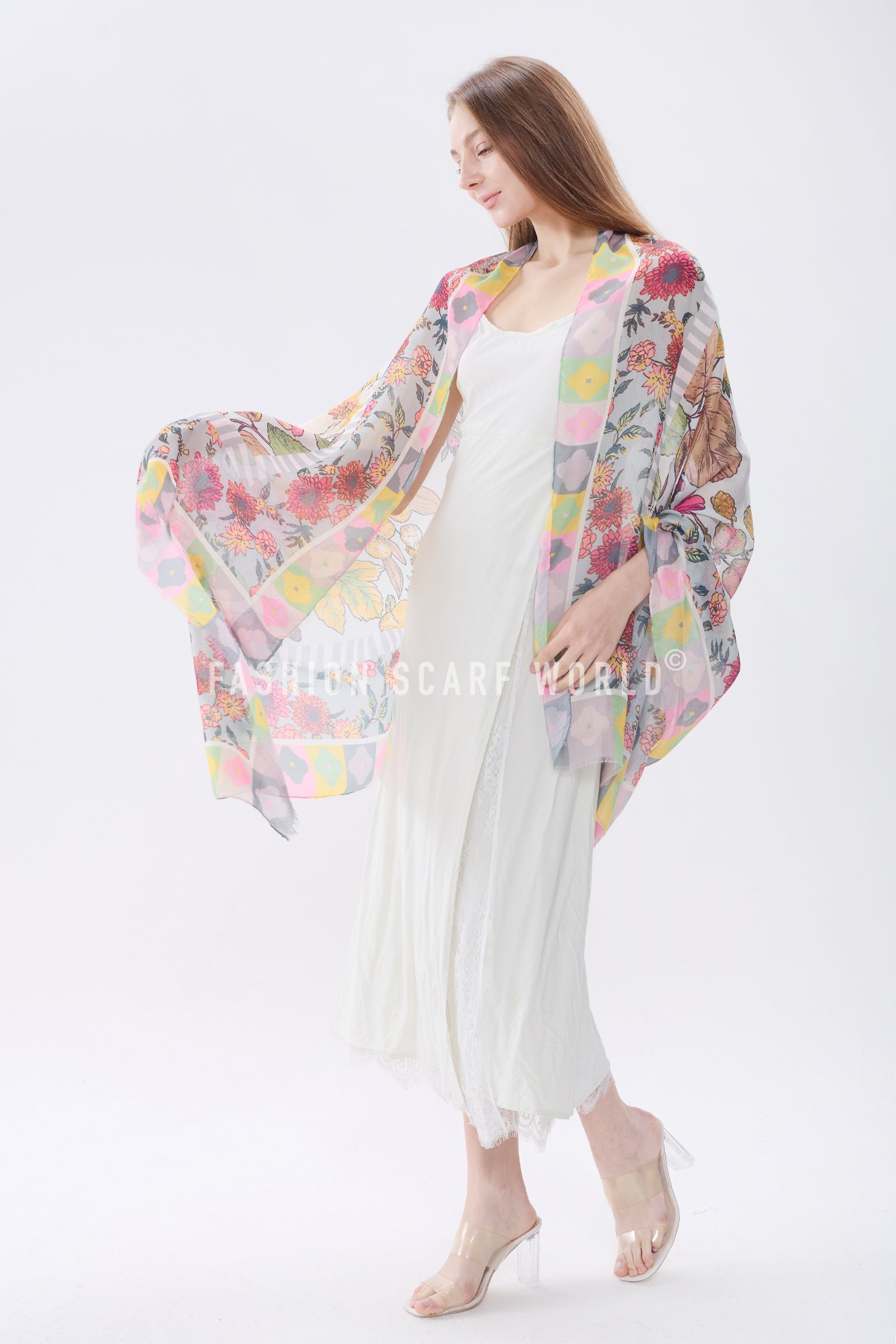 Vibrant Floral Border Print Frayed Scarf