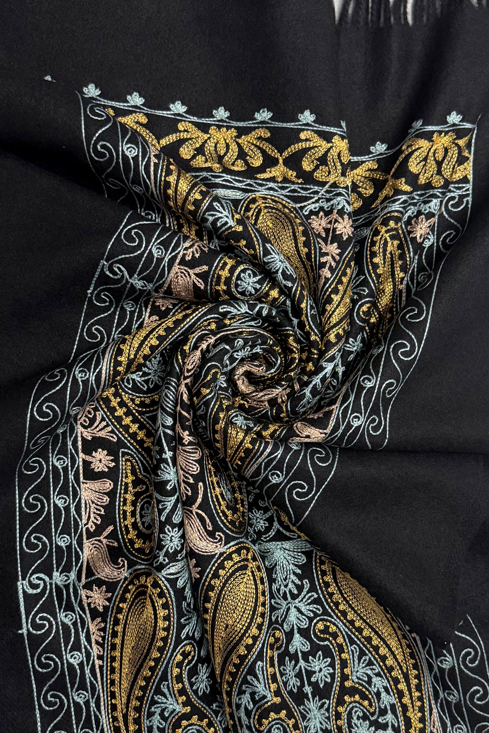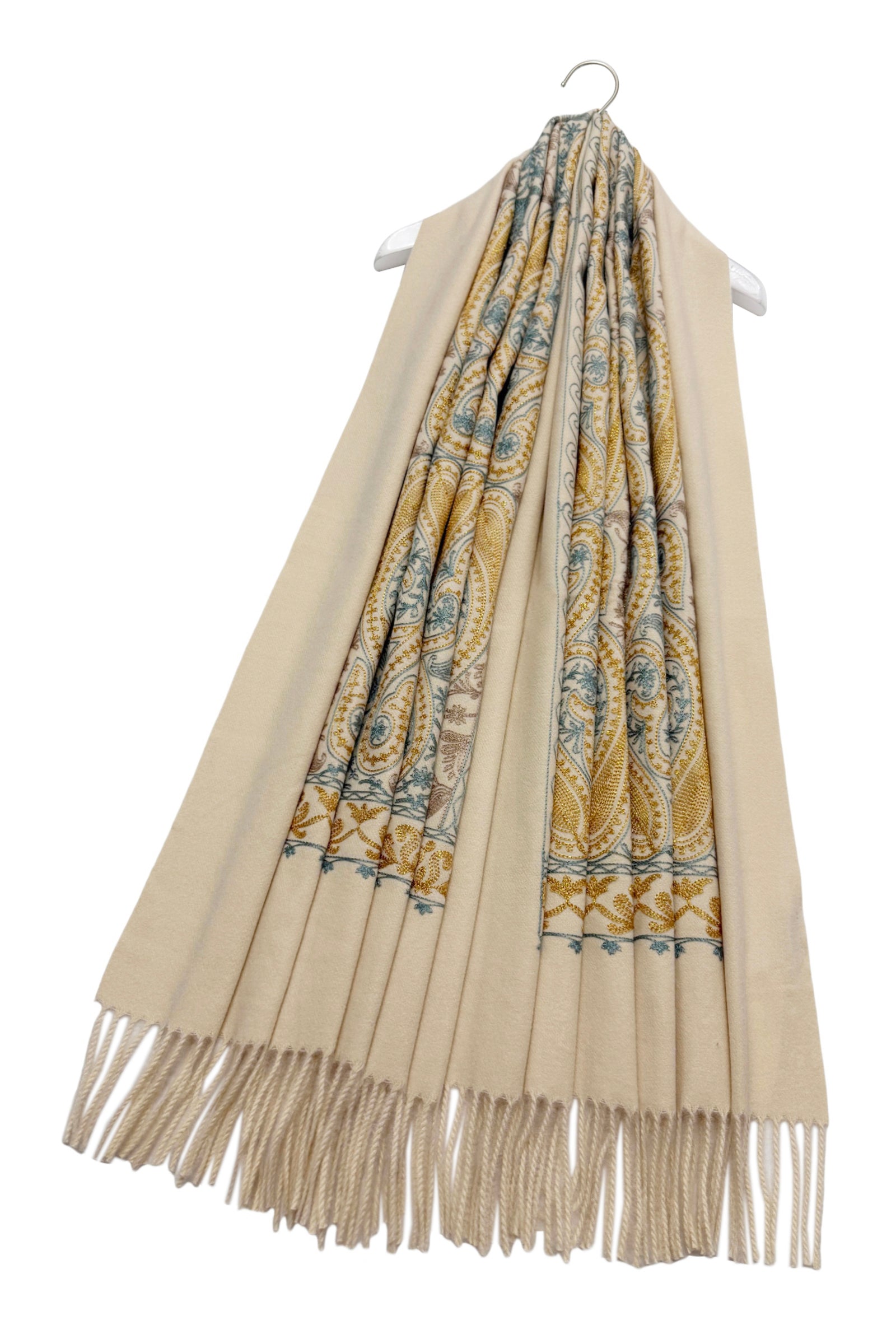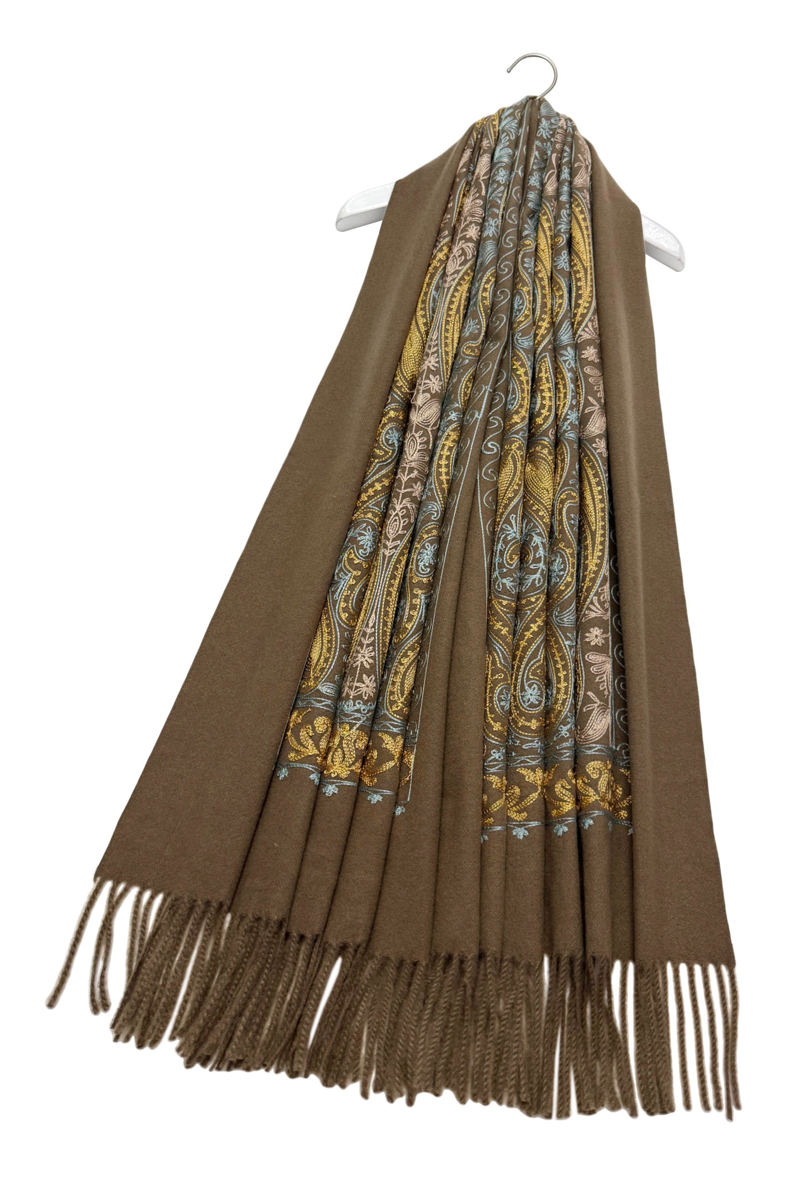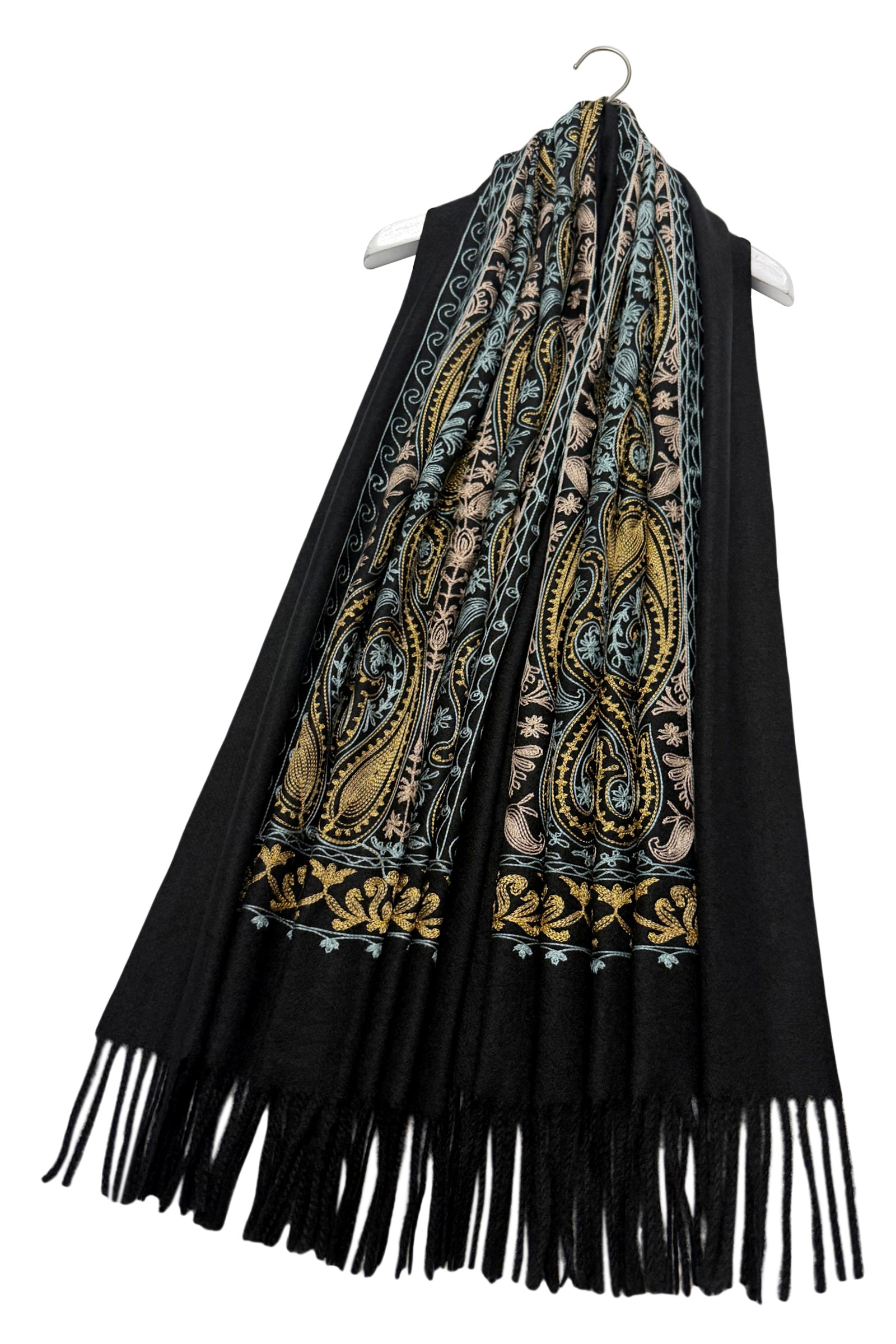 Intricate Paisley Panel Embroidered Wool Tassel Scarf