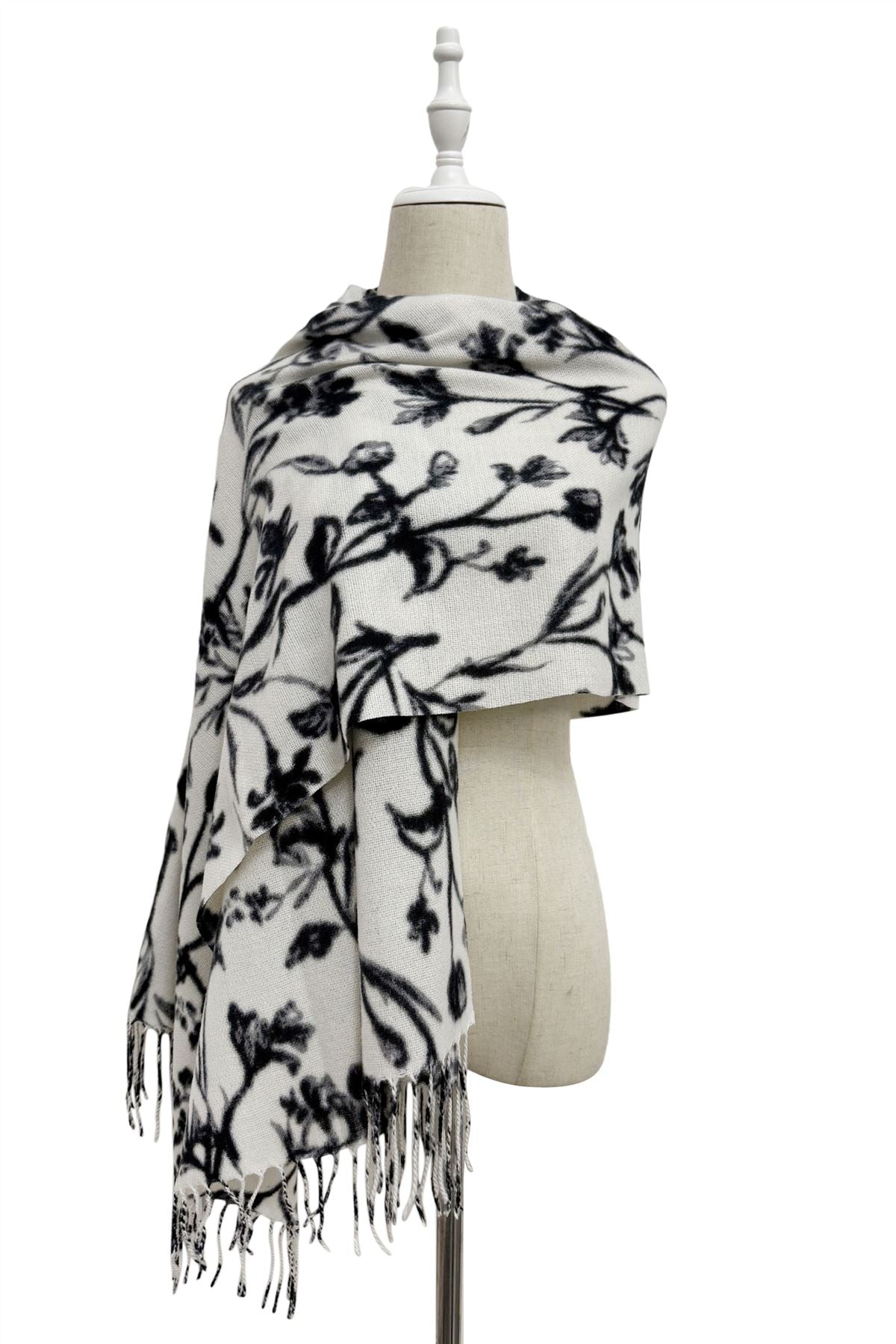 Monochrome Floral Print Wool Tassel Scarf
